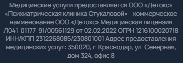 Клиника работает с выездом по СПб и Ленинградской области, а также в комфортабельном стационаре с круглосуточным наблюдением, полным обследованием и применением аппаратных методик. Безопасность обеспечивают сертифицированные препараты и стаж практикующих наркологов от 10 лет.